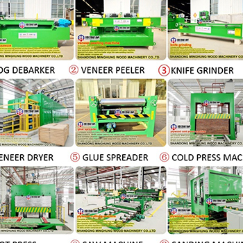 Makineler şunları içerir: ahşap kütük kabuk soyucu, kaplama soyma makinesi, kaplama istifleyici, kaplama kurutma makinesi, kontrplak kaplama döşeme hattı, çekirdek besteci, kontrplak soğuk pres makinesi, kontrplak sıcak pres makinesi, kontrplak testere makinesi, kontrplak zımpara makinesi, kaldırma tablası.