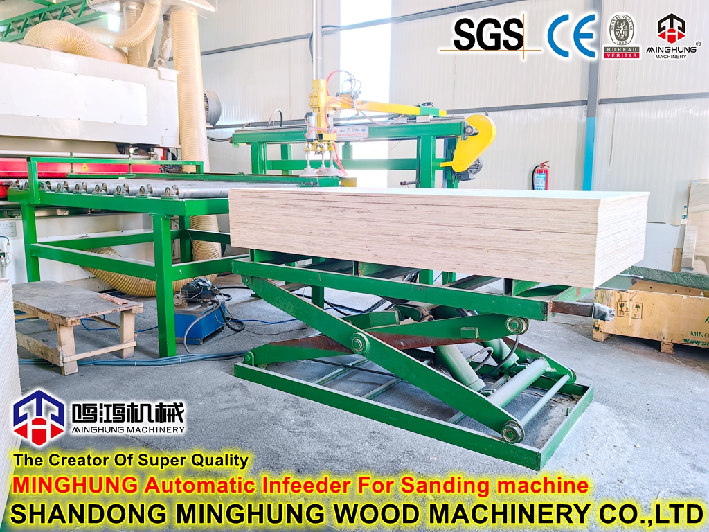 4. Zımparalama: Geniş kemer kalibre edici kumlayıcılar, tipik olarak çok başlı (örn. 4-6 baş) ve ağır hizmet, ince yüzey kaplaması için kullanılır, hassas kalınlıkta pürüzsüz, düz bitmiş paneller elde etmek için önceden sertleştirilmiş tabaka ve kalınlık varyasyonunu giderir.
