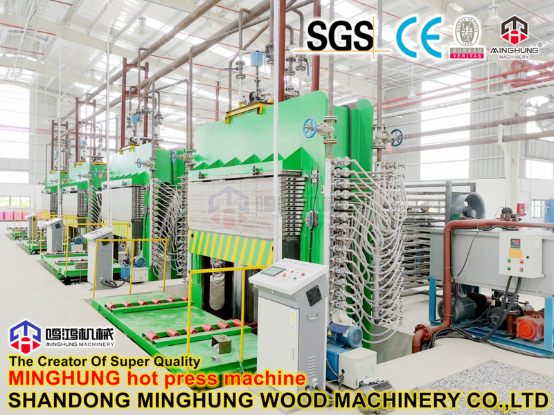 MINGHUNG Kontrplak Yapıştırılmış kontrplağı preslemek için sıcak pres makinesi, tek bir sağlam, güçlü ve kaliteli tahta olmasını sağlar.Sıcak pres makinesi kontrplak kalitesi için çok önemlidir.